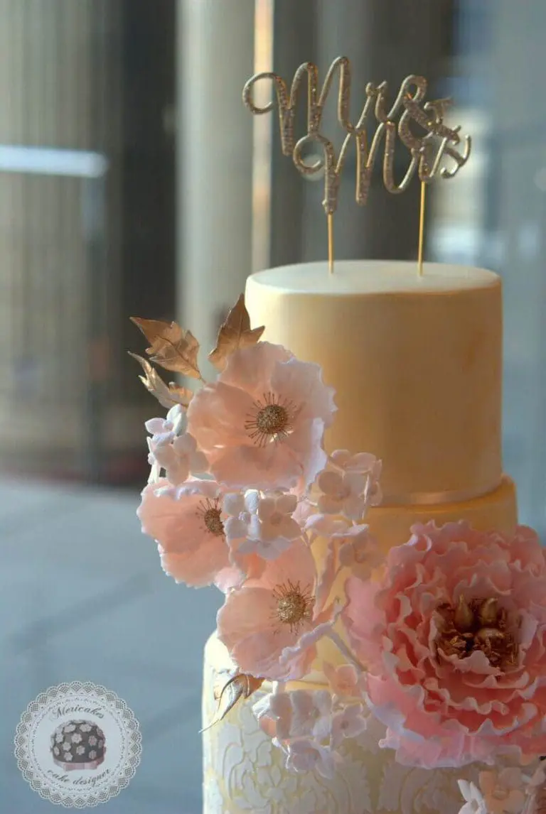 Las flores de azúcar están realizadas enteramente a mano y son íntegramente comestibles. La cobertura esta realizada con Satin Ice y perlada en oro viejo.