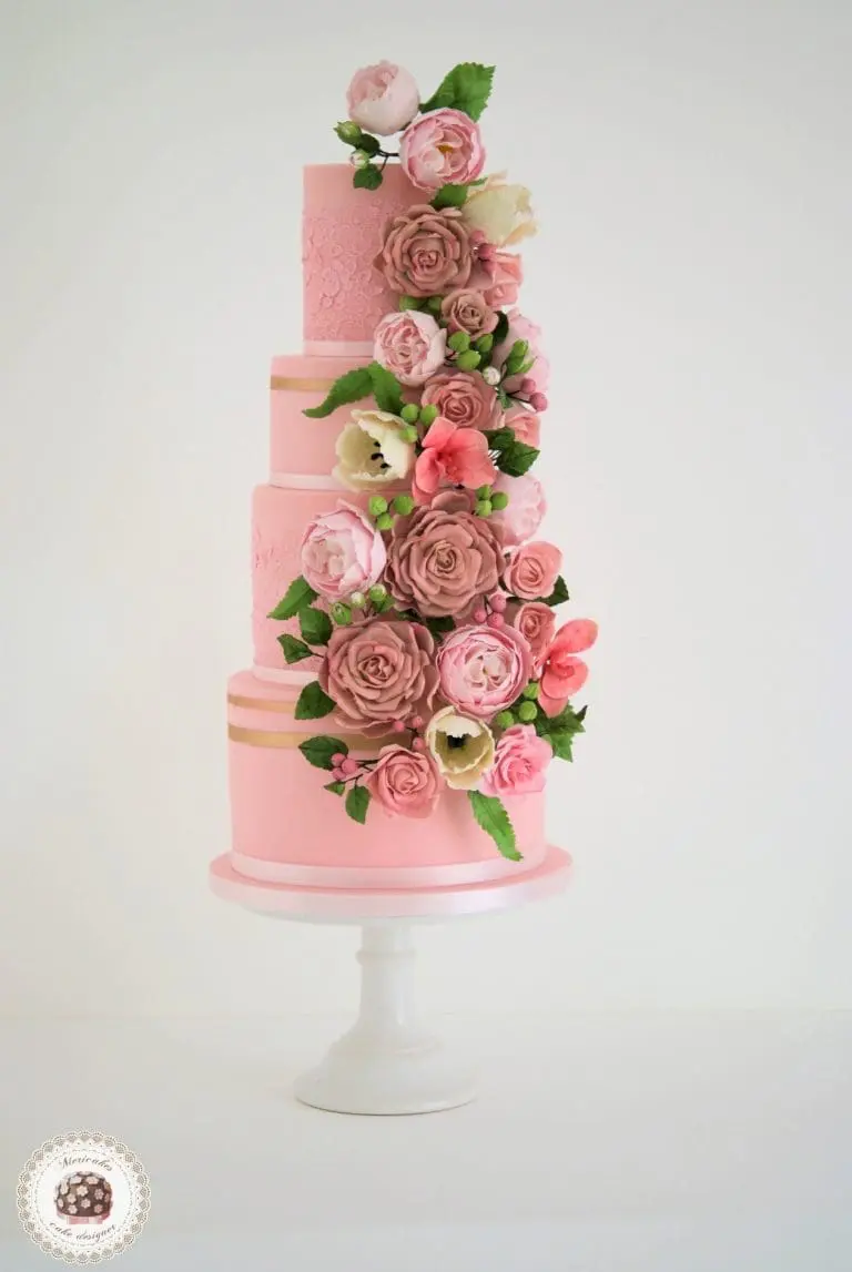 Los pisos están decorados con encaje de azucar comestible en rosa empolvado y unas líneas de oro rosa.