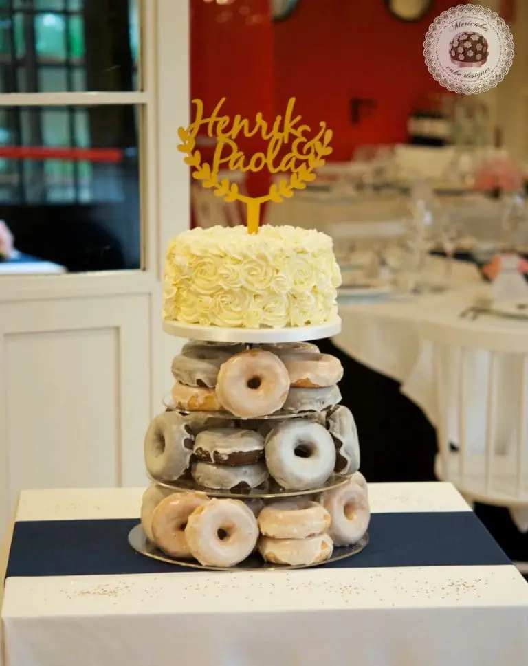El pasado sábado estuvimos en el hotel H10 Metropolitan para montar una torre de doughnuts coronada con una tarta con rosas de crema y un topper con los nombres de los novios.