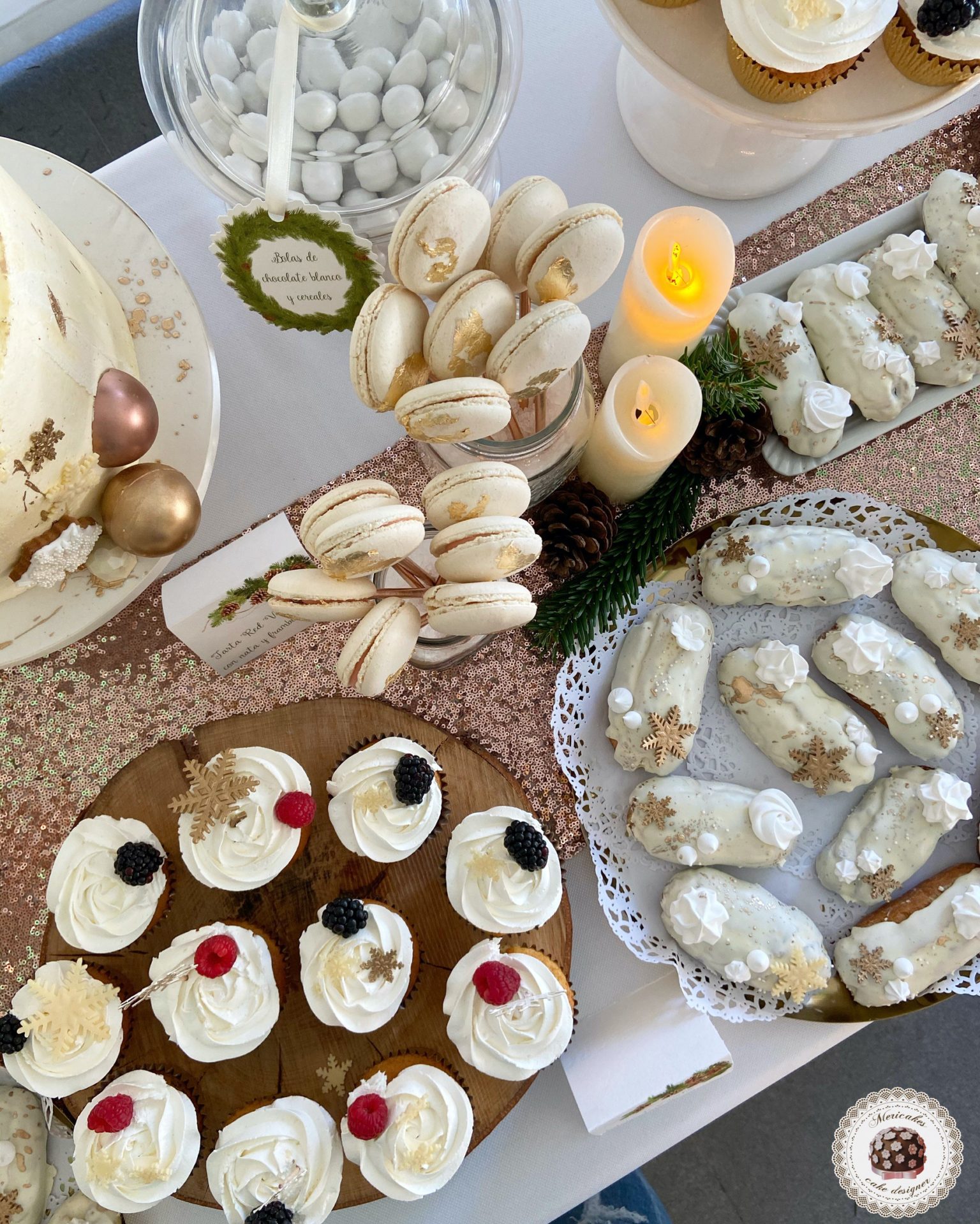 Winter Wonderland dessert table, mericakes, mesa dulce, dessert table, cakesicles, macarons, eclairs, red velvet, barcelona party, party inspiration, christmas table, pastry chef, 9