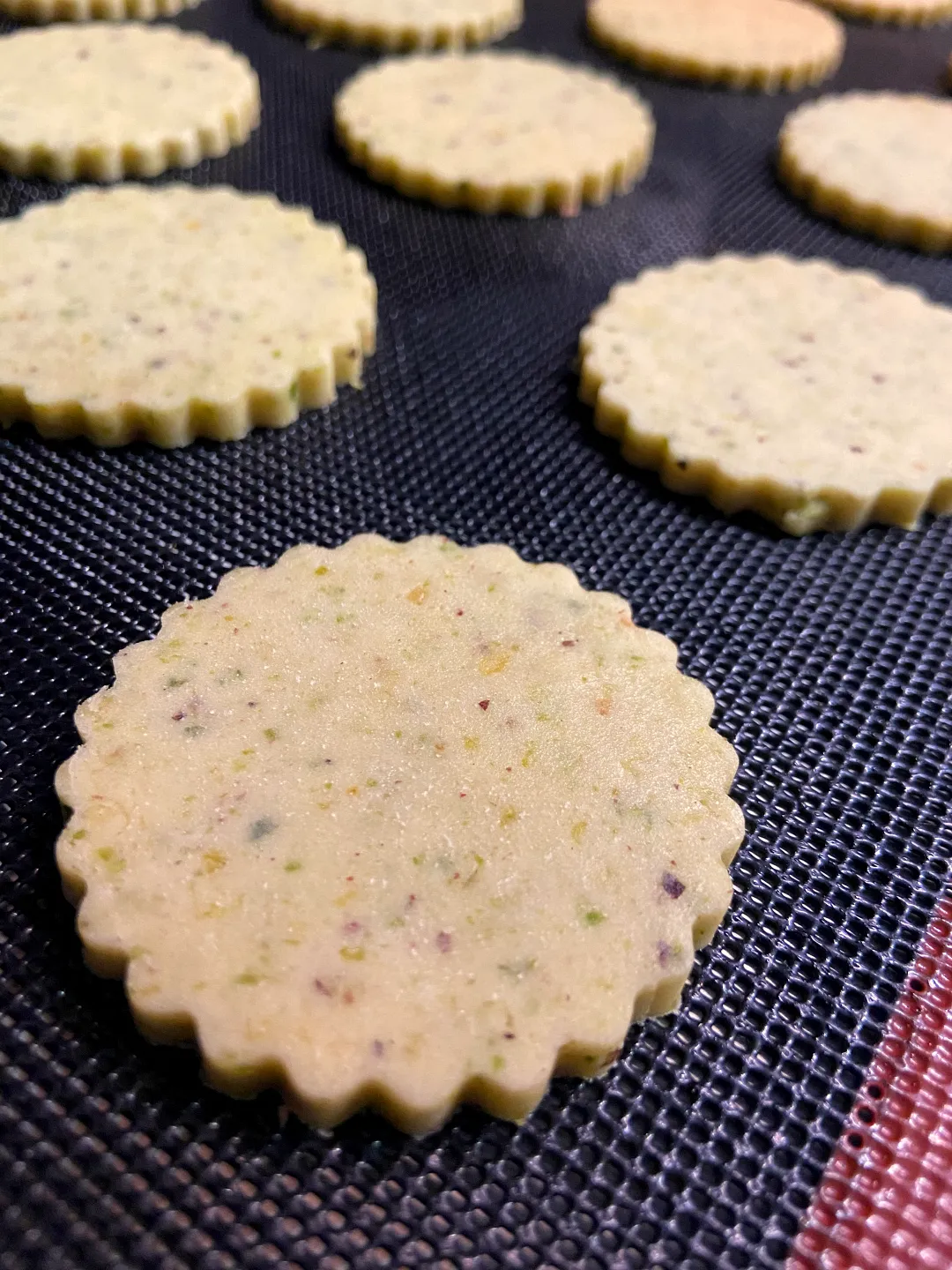 - Cortar y hornear:Coloca las galletas (siempre del mismo tamaño, ya que el tiempo de horneado no es el mismo) encima de una bandeja de hornear dejando un espacio entre galleta y galleta, no es necesario engrasar la bandeja de hornear.Con los recortes que nos sobren, une en una bola y estirar nuevamente con el mismo procedimiento anterior.Enfría en la nevera un mínimo de 15 minutos, estos recortes los puedes utilizar hasta 3 veces (luego la masa queda muy agrietada, siguen estando ricas, pero no son muy estéticas) Precalienta el horno a 180 ℃ e introduce la bandeja de hornear a altura media.El tiempo de cocción varía en función del tamaño de la galleta y del horno. Mi cortador es de 6cm de diámetro y en 8 minutos ya estaban doradas. Lo ideal es que a partir de los 5 minutos estes muy pendientes, 2 minutos pueden ser la diferencia entre unas galletas perfectas y unas quemadas. Cuando las saques del horno, déjalas enfriar encima de una rejilla. En este momento encontrarás que las galletas resultan un poco blandas, pero al enfriarse se endurecen.