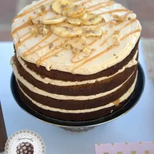 Para el interior de la tarta, escogieron un sabor cada vez más popular entre nuestros clientes. “LA DOLCE VITA”. Tarta de plátano, nueces y un toque de canela, rellena de crema suiza de dulce de leche y trocitos de plátano confitado.