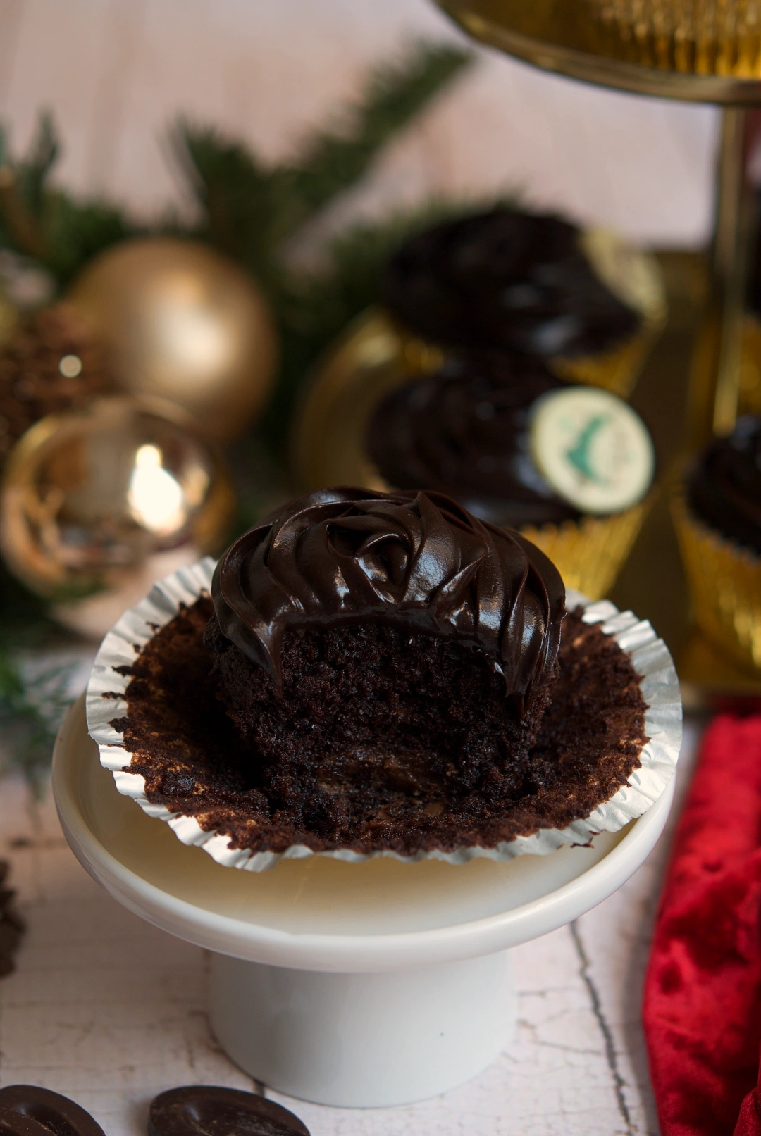 - Precalienta el horno a 170 ℃ grados. Coloca cápsulas de papel en un molde para cupcakes.Añade el café caliente sobre el chocolate negro y el cacao puro y mezcla hasta que se funda. Deja atemperar la mezcla mientras sigues con la receta.Mezcla la harina, el azúcar, la sal y el bicarbonato y reserva.Bate el aceite, los huevos, el vinagre y el extracto de vainilla en la mezcla de chocolate enfriada hasta que quede suave. Añade la mezcla de harina con la pala plana (o movimientos envolventes si lo haces a mano) hasta que queden bien integrados los ingredientes secos.Por último, añade las pepitas de chocolate y mezcla con movimientos envolventes para que queden bien repartidas por la masa.Mete la masa en una manga. Rellena un 60% de capacidad de cada cápsula con la masa. Luego añade en el centro de cada cupcakes el equivalente a 1 cucharadita de ganache (si no lo ves claro con la manga pastelera, puedes ayudarte con un par de cucharillas). Hornea 15 min y deja enfriar antes de decorar. Para una muerte por chocolate como dios manda, los hemos decorado con una crema de chocolate negro, pero puedes decorarla con tu crema favorita o comértelo tal cual!